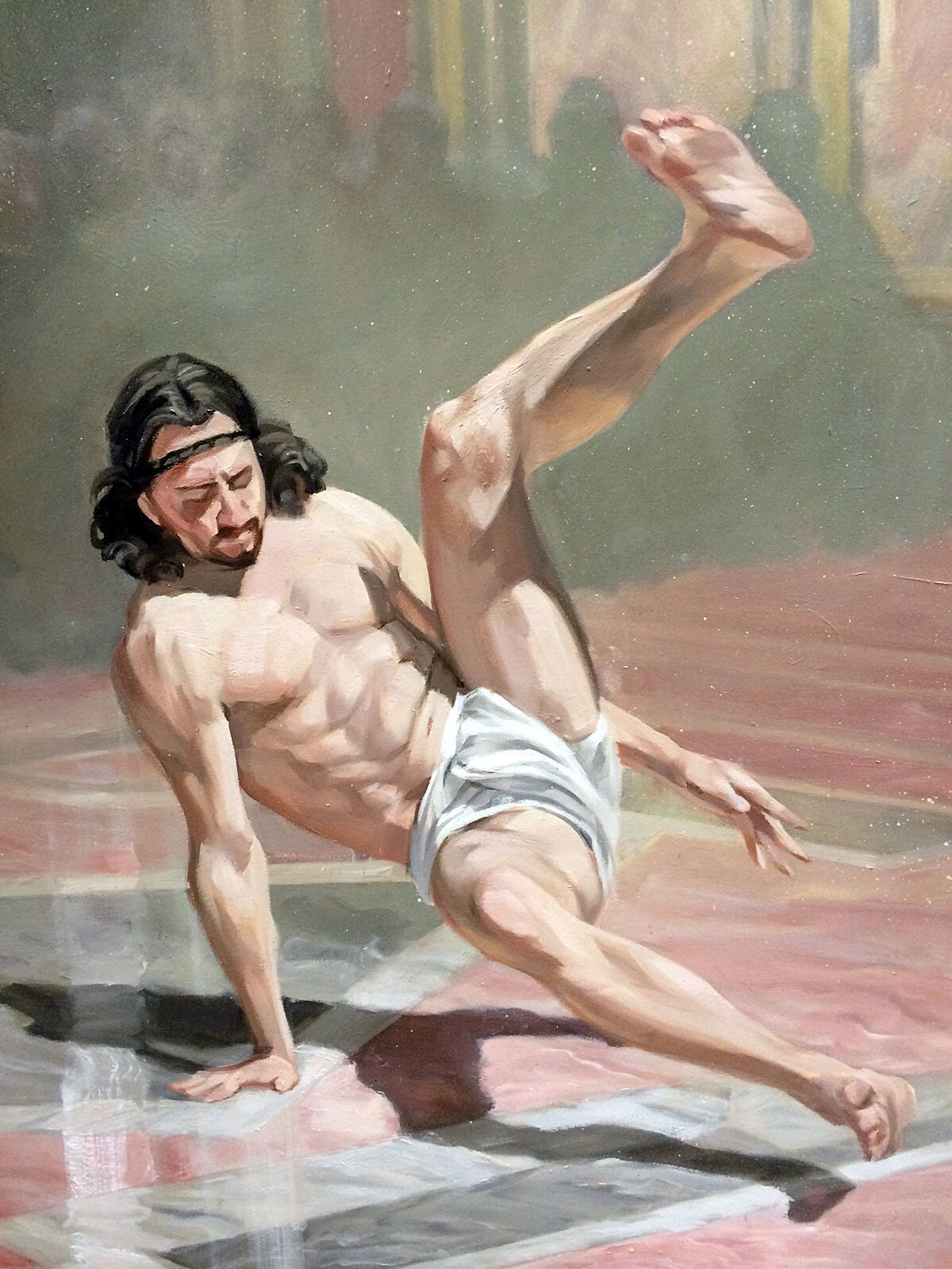 Between 97 and 09 he found work as an art director in advertising and then as a scene artist on the film set. He painted everything from large scenic backgrounds to old masterpieces hanging as requisites, from murals to graffiti. His now famous painting “Breakdancing Jesus” was one of the ideas Cosmo Sarson had in the 12 dark years when he had no atelier.