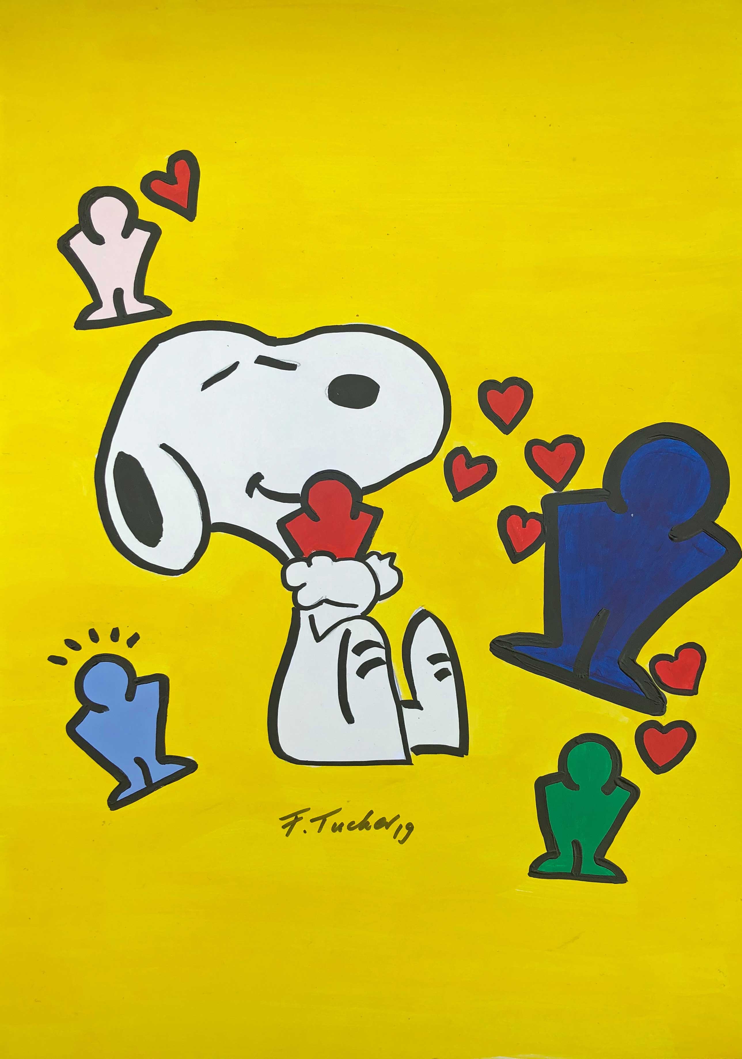 Francis Tucker was born in Cologne in 1964. After his studies he began to focus his work in 1995 in the style of Pop Art. In his colorful paintings there are often easy figures, which are only represented by a black line start. Moreover, the figures have the name “Tucker”. Francis Tucker – Snoopy