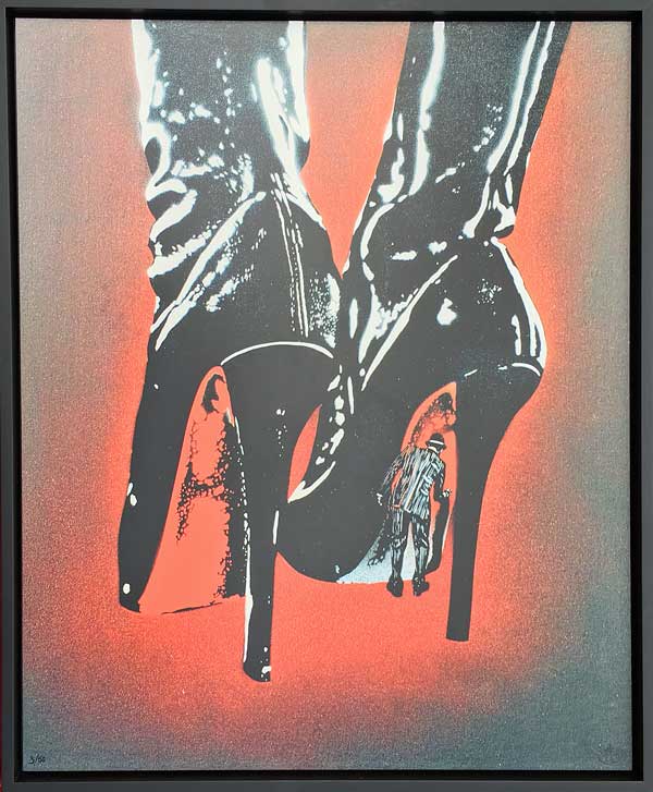 His paintings often feature a bowler-hatted gentleman ‘vandal’, which featured in a video by The Black Eyed Peas.