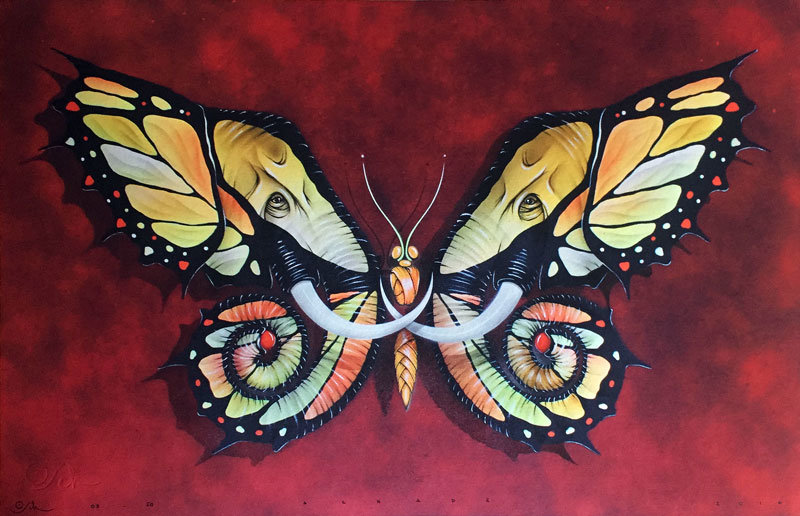 Otto Schade, a Chilean artist. Here with his new print Elephutterfly 50. He takes us to this ethereal world that teeters between the surreal and abstract, opening his audience’s mind to the oniric. Born on October 30, 1971. Otto Schade’s journey as a prominent artist started with his blossoming career as both an architect and urban sculptor. From this arose a passion for painting, which he has been partaking in since 1996. This ardor for the art itself has resulted in various solo exhibits around the world. He exhibited inChile, Germany, the United States, England, Japan, the Netherlands, Russia and Paris.
