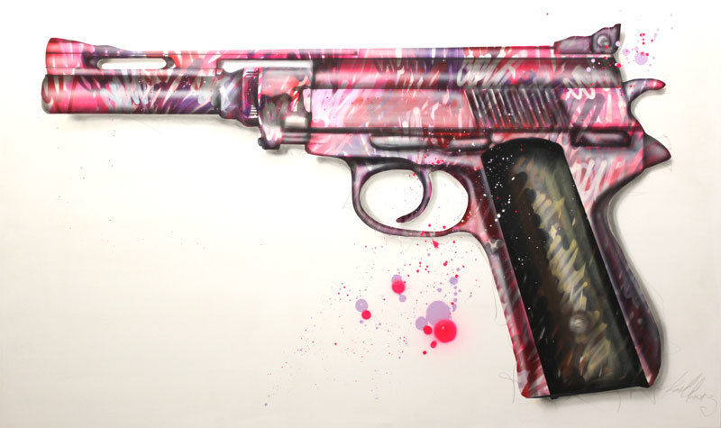 In Wolfgang Krells latest work, he experimented with a mixture of stencils and spray paint, acrylic and pencil. To this day the spray can has remained a loyal companion since the beginning. but they are not his first choice of tools. Influenced by American graffiti in his first works in 1983 he oriented towards realistic painting in 2005. Weapons are a recurring theme in his painting. Beyond a representation of violence, weapons express the color of rebellion in an intellectual game, a metaphor, a provocative revealing.